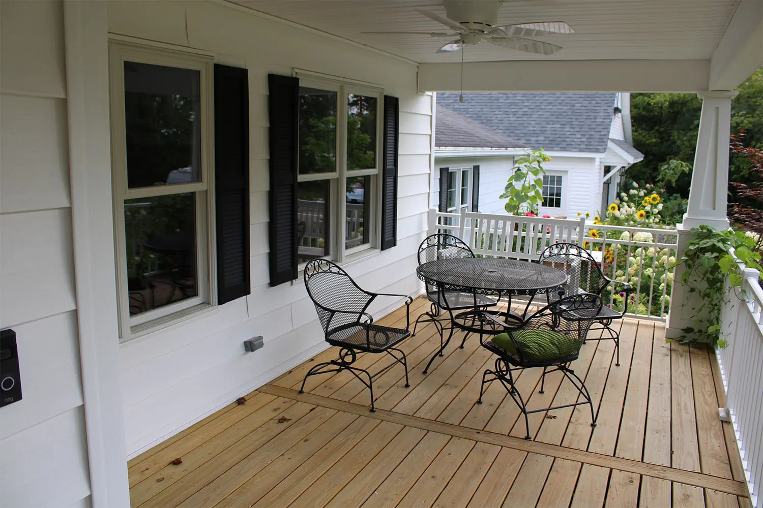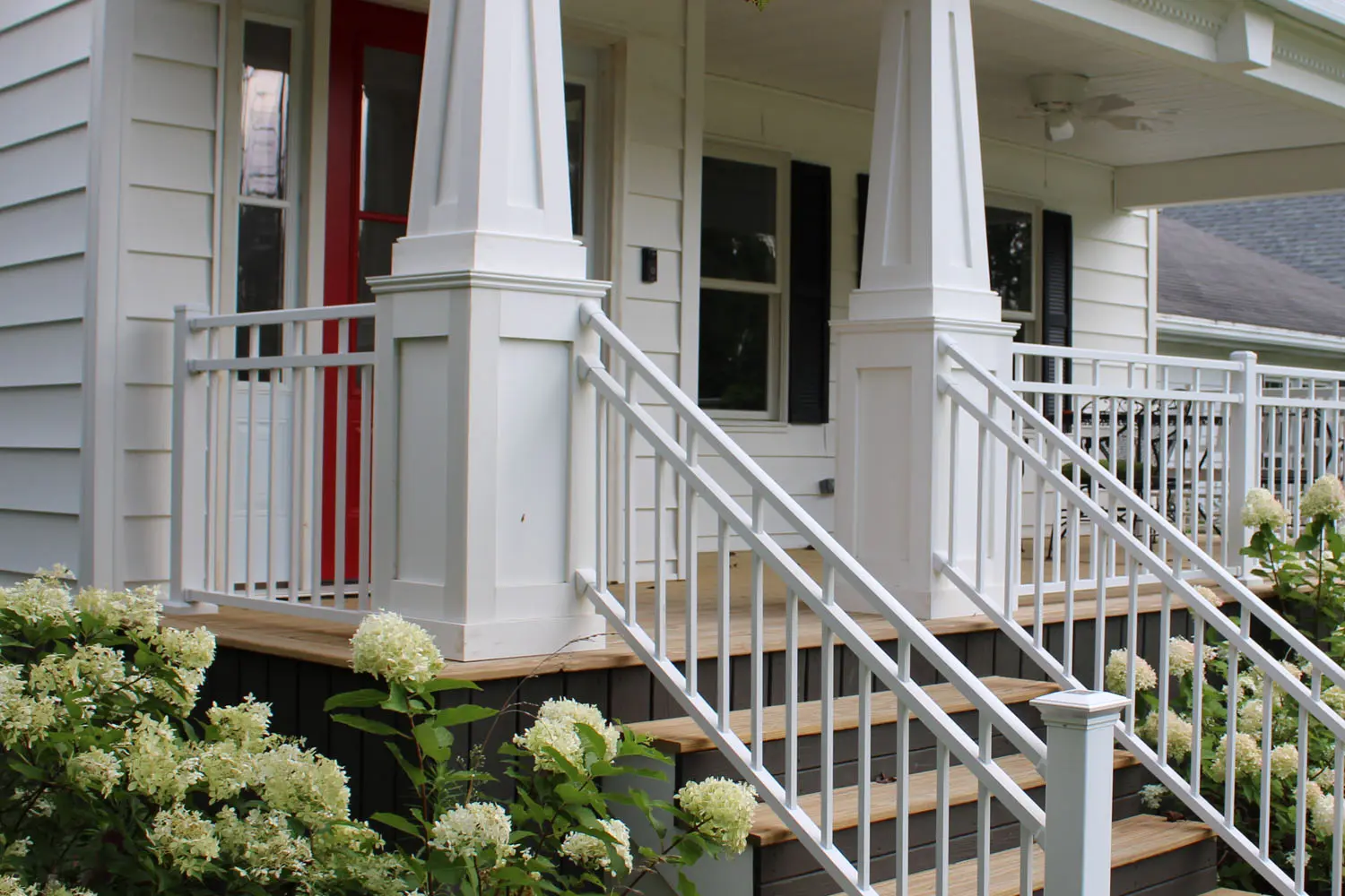 The changes to the front elevation can be best appreciated with the “before and after” photos. The original colonial style architecture with skinny two-story posts were deleted to make way for a new first floor porch roof and deck across the front of the house. Craftsman style columns and railing create a striking front elevation. The front door entry location is moved to the left side of the porch to help achieve the interior layout.