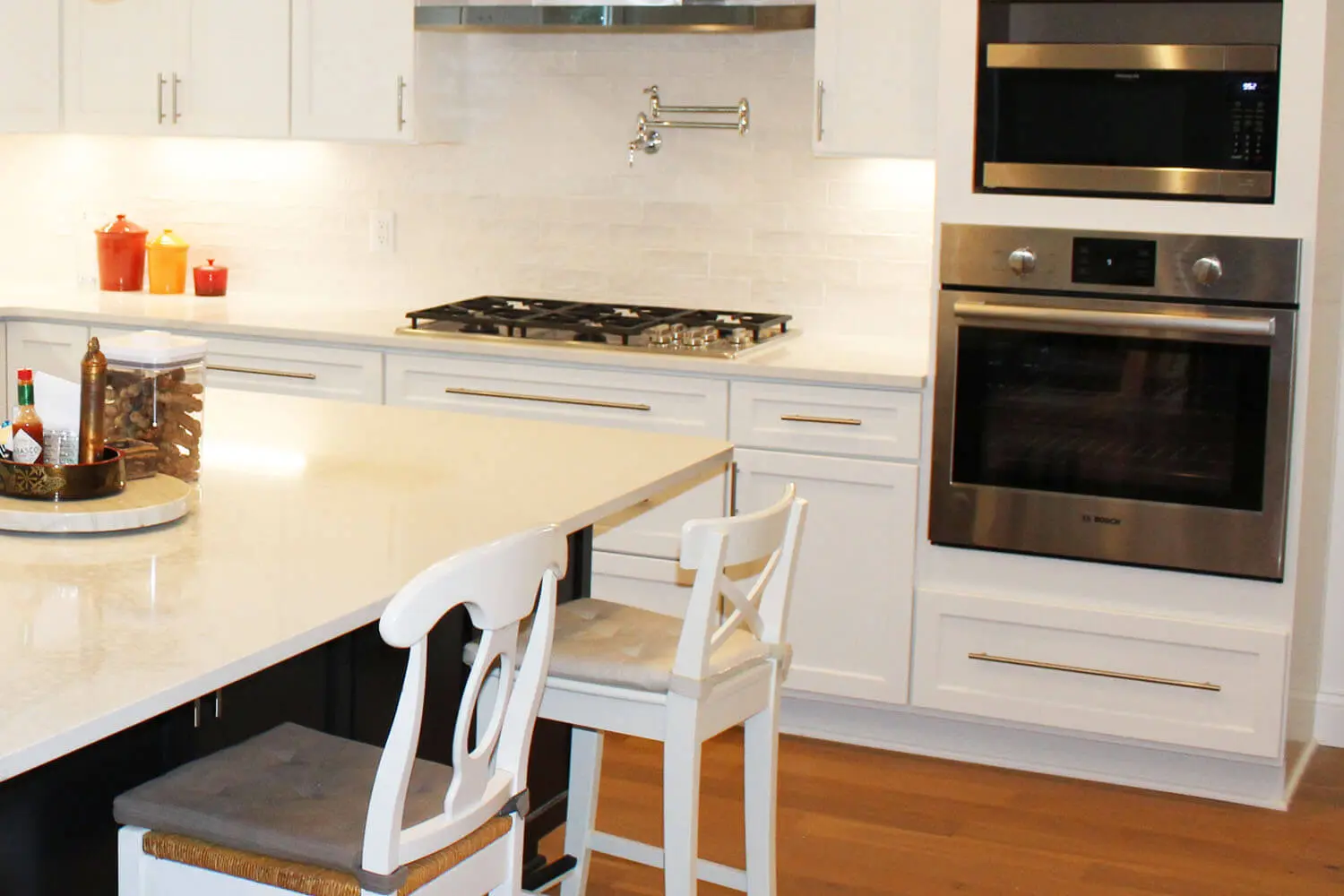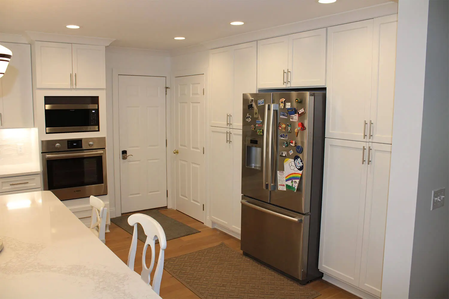 The kitchen remodel required a significant layout change by removing walls and distributing space to enlarge the size of the kitchen. The demo of interior walls, flooring, and other items was extensive. However, it allowed us to create a whole new kitchen footprint and cabinet layout. Unique craftsman style interior columns were integrated into the design to pull the exterior upgrades together with the interior changes. The combination of new flooring, two tone kitchen/island cabinets, quartz countertops, large crown molding, base trim, and a stunning backsplash created an amazing new kitchen.